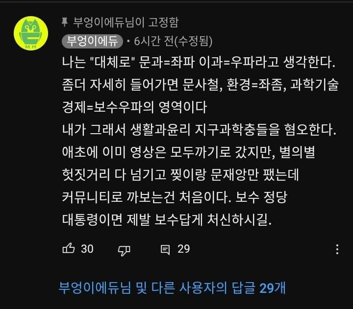 "문과는 좌빨, 이과는 엑윽보수" 존슨 4 2023.06.20 12:27 그럼 고졸, 예체능은 어느 쪽이냐? 정작 문과영역인 경제는 은근슬쩍 우파쪽에 넣네같은 이과계열인 지구과학은 왜 좌빨임 ㅋㅋ