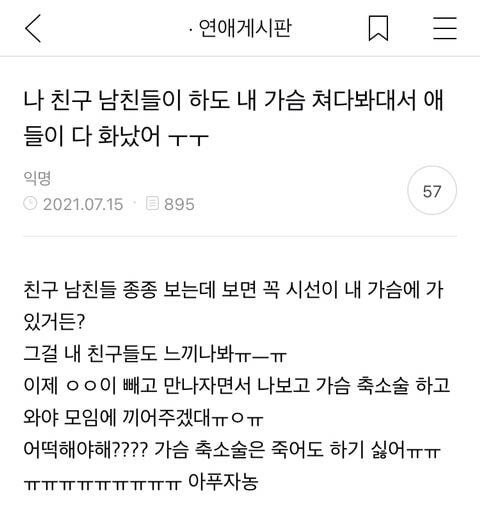 나 친구 남친들이 하도 내 가슴만 쳐다봐대서 애들이 다 화났어 ㅜㅜ