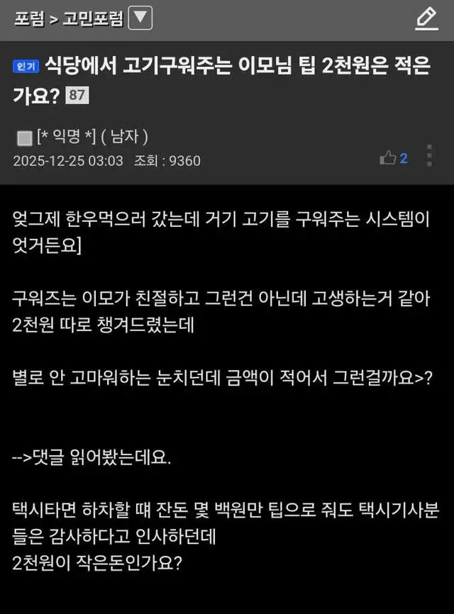 식당에서 고기 구워주는 이모님 팁 2천원은 적은가요?