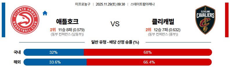 11월29일 애틀랜타:클리블랜드 NBA 분석 및 예측 스포츠중계:스포츠무료중계