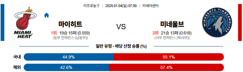 01월04일 마이애미:미네소타 NBA 분석 및 예측 스포츠중계:스포츠무료중계