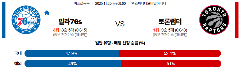 11월20일 필라델피아:토론토 NBA 분석 및 예측 스포츠중계:스포츠무료중계