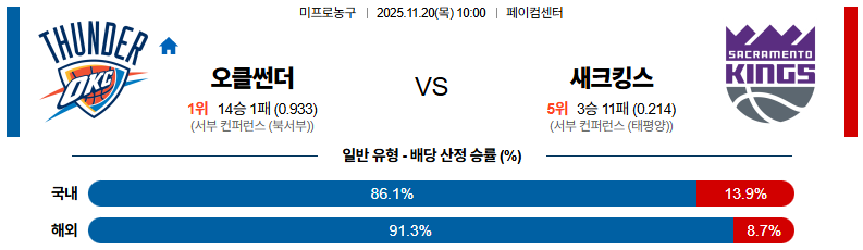 11월20일 오클라호마시티:새크라멘토 NBA 분석 및 예측 스포츠중계:스포츠무료중계