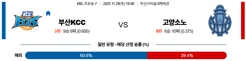 11월20일 부산KCC:고양소노 KBL 분석 및 예측 스포츠중계:스포츠무료중계