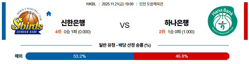 11월21일 신한은행:하나은행 WKBL 분석 및 예측 스포츠중계:스포츠무료중계