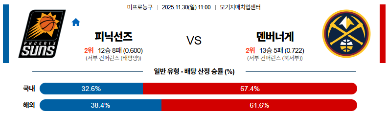 11월30일 피닉스:덴버 NBA 분석 및 예측 스포츠중계:스포츠무료중계