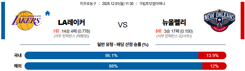 12월01일 LA레이커스:뉴올리언즈 NBA 분석 및 예측 스포츠중계:스포츠무료중계