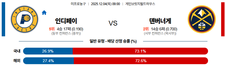 덴버가 인디애나의 리바운드와 수비의 약점을 잘 활용할 것으로 보이며, 승리할 가능성이 높습니다.