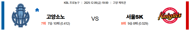 고양소노 대 서울SK KBL 12월05일 맞대결 생중계, 스포츠중계, 스포츠분석
