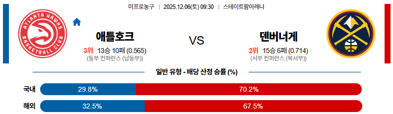 애틀랜타 대 덴버 NBA 12월06일 맞대결 생중계, 스포츠중계, 스포츠분석