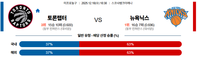 뉴욕이 최근 맞대결에서 9연승을 기록하고 있으며, 토론토의 외곽 수비 붕괴와 턴오버 불안이 지속되고 있는 점을 고려할 때, 뉴욕의 승리 가능성이 높다고 판단됩니다.