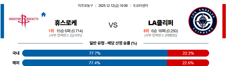 휴스턴이 홈에서 안정적인 흐름을 유지하고 있으며, LA 클리퍼스는 최근 부진한 모습이 계속되고 있어 휴스턴의 승리가 예상됩니다.