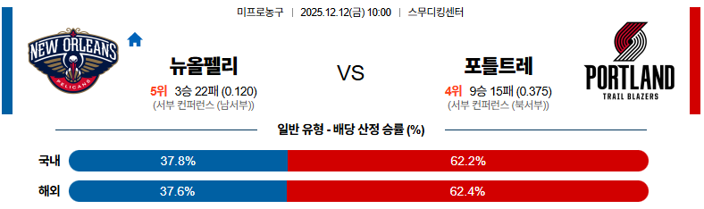 포틀랜드 승리와 언더를 추천드립니다. 뉴올리언즈의 경기력 저하로 인해 저조한 득점이 예상됩니다.