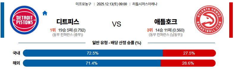 디트로이트 대 애틀랜타 NBA 12월13일 맞대결 생중계, 스포츠중계, 스포츠분석