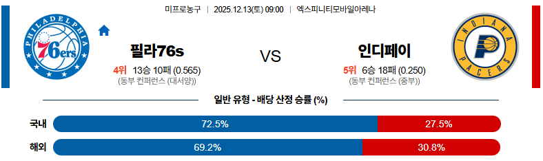 필라델피아 대 인디애나 NBA 12월13일 맞대결 생중계, 스포츠중계, 스포츠분석