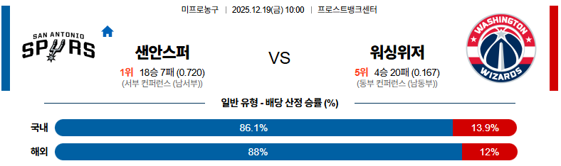 12월19일 샌안토니오:워싱턴 NBA 분석 및 예측 스포츠중계:스포츠무료중계