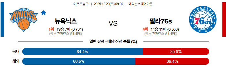 12월20일 뉴욕:필라델피아 NBA 분석 및 예측 스포츠중계:스포츠무료중계