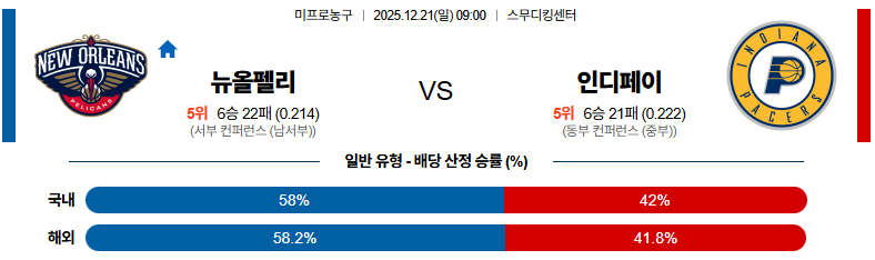 12월21일 뉴올리언스:인디애나 NBA 분석 및 예측 스포츠중계:스포츠무료중계