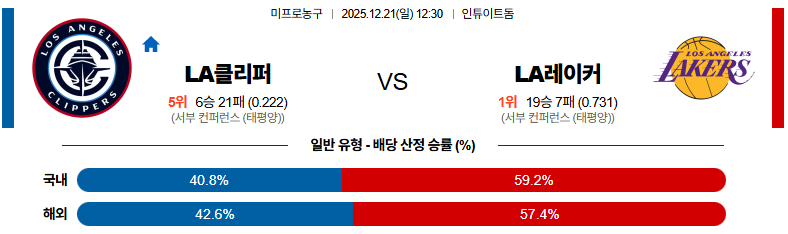 12월21일 LA클리퍼스:LA레이커스 NBA 분석 및 예측 스포츠중계:스포츠무료중계
