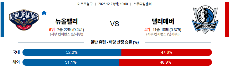 12월23일 뉴올리언스:댈러스 NBA 분석 및 예측 스포츠중계:스포츠무료중계