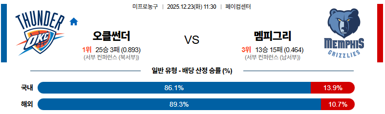 12월23일 오클라호마시티:멤피스 NBA 분석 및 예측 스포츠중계:스포츠무료중계