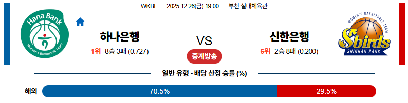 12월26일 하나은행:신한은행 WKBL 분석 및 예측 스포츠중계:스포츠무료중계