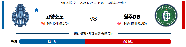 12월27일 고양소노:원주DB KBL 분석 및 예측 스포츠중계:스포츠무료중계