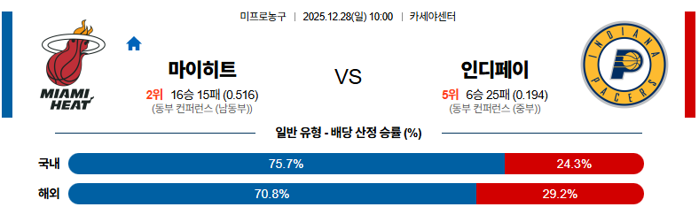 12월28일 마이애미:인디애나 NBA 분석 및 예측 스포츠중계:스포츠무료중계