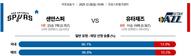 12월28일 샌안토니오:유타 NBA 분석 및 예측 스포츠중계:스포츠무료중계