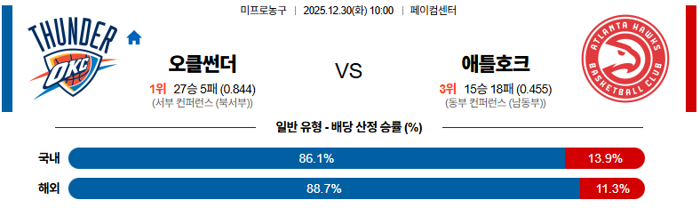 12월30일 오클라호마시티:애틀랜타 NBA 분석 및 예측 스포츠중계:스포츠무료중계