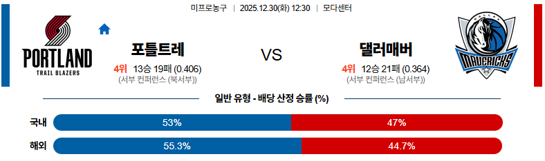 12월30일 포틀랜드:댈러스 NBA 분석 및 예측 스포츠중계:스포츠무료중계