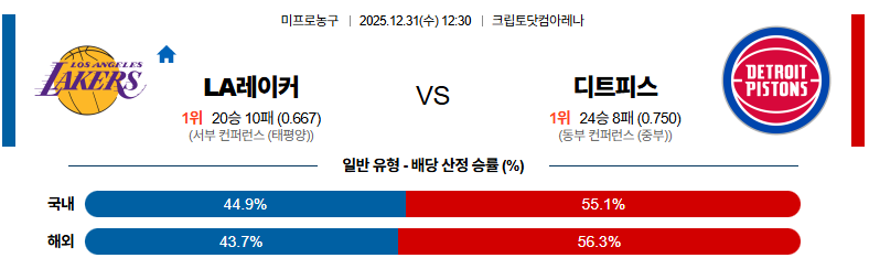 12월31일 LA레이커스:디트로이트 NBA 분석 및 예측 스포츠중계:스포츠무료중계