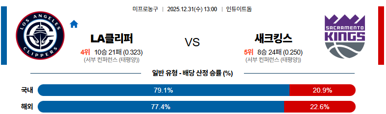 12월31일 LA클리퍼스:새크라멘토 NBA 분석 및 예측 스포츠중계:스포츠무료중계