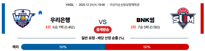 12월31일 우리은행:BNK썸 WKBL 분석 및 예측 스포츠중계:스포츠무료중계