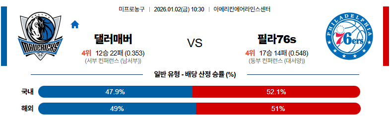 01월02일 댈러스:필라델피아 NBA 분석 및 예측 스포츠중계:스포츠무료중계
