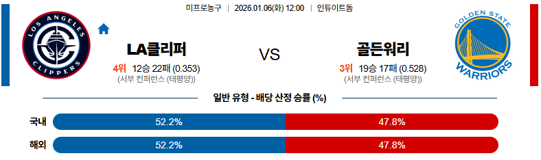 01월06일 LA클리퍼스:골든스테이트 NBA 분석 및 예측 스포츠중계:스포츠무료중계