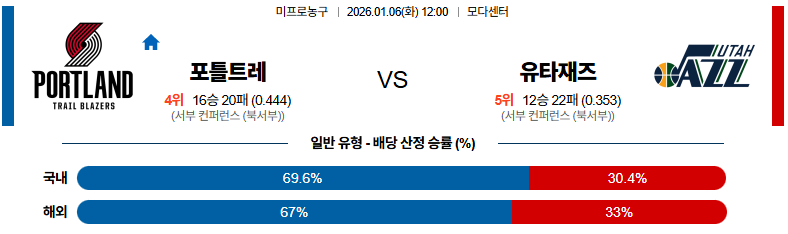 01월06일 포틀랜드:유타 NBA 분석 및 예측 스포츠중계:스포츠무료중계