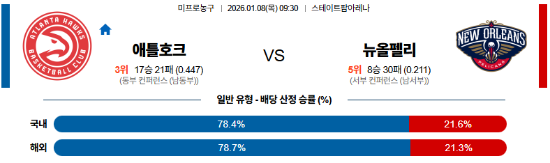 01월08일 애틀랜타:뉴올리언즈 NBA 분석 및 예측 스포츠중계:스포츠무료중계
