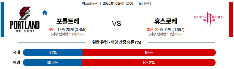 01월08일 포틀랜드:휴스턴 NBA 분석 및 예측 스포츠중계:스포츠무료중계
