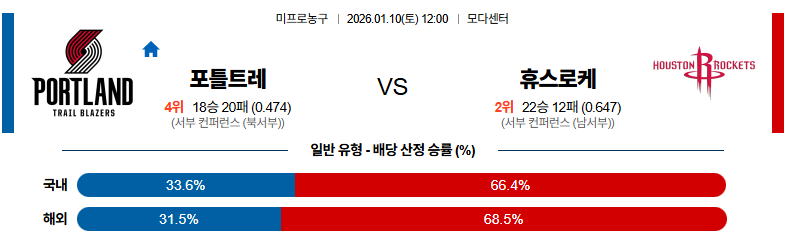 01월10일 포틀랜드:휴스턴 NBA 분석 및 예측 스포츠중계:스포츠무료중계