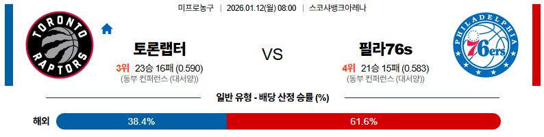 01월12일 토론토:필라델피아 NBA 분석 및 예측 스포츠중계:스포츠무료중계