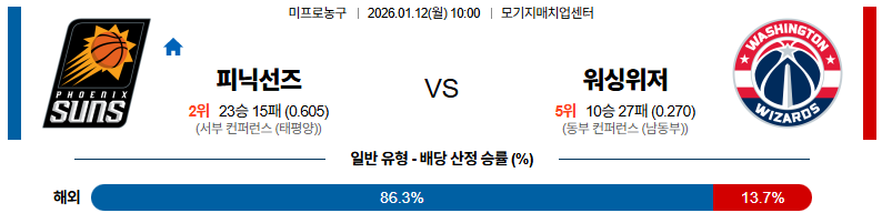 01월12일 피닉스:워싱턴 NBA 분석 및 예측 스포츠중계:스포츠무료중계