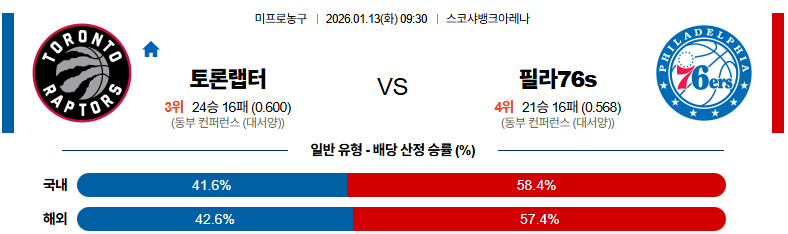 01월13일 토론토:필라델피아 NBA 분석 및 예측 스포츠중계:스포츠무료중계