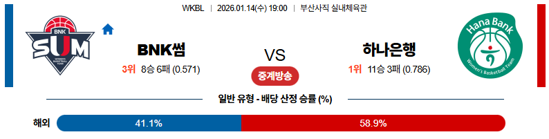 01월14일 BNK썸:하나은행 WKBL 분석 및 예측 스포츠중계:스포츠무료중계