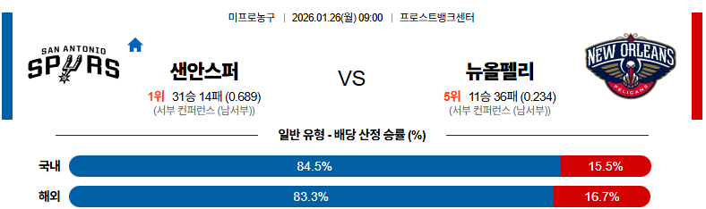 01월26일 샌안토니오:뉴올리언즈 NBA 분석 및 예측 스포츠중계:스포츠무료중계