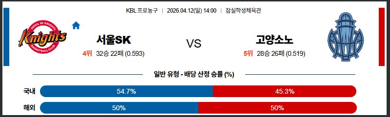 04월12일 서울SK:고양소노 KBL 분석 및 예측 스포츠중계:스포츠무료중계