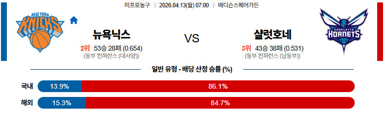 04월13일 뉴욕:샬럿 NBA 분석 및 예측 스포츠중계:스포츠무료중계