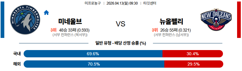 04월13일 미네소타:뉴올리언즈 NBA 분석 및 예측 스포츠중계:스포츠무료중계