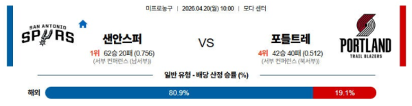 04월20일 샌안토니오 : 포틀랜드 NBA 분석 및 예측 스포츠중계,스포츠분석