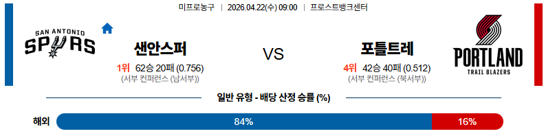 04월22일 샌안토니오 : 포틀랜드 NBA 분석 및 예측 스포츠중계,스포츠분석
